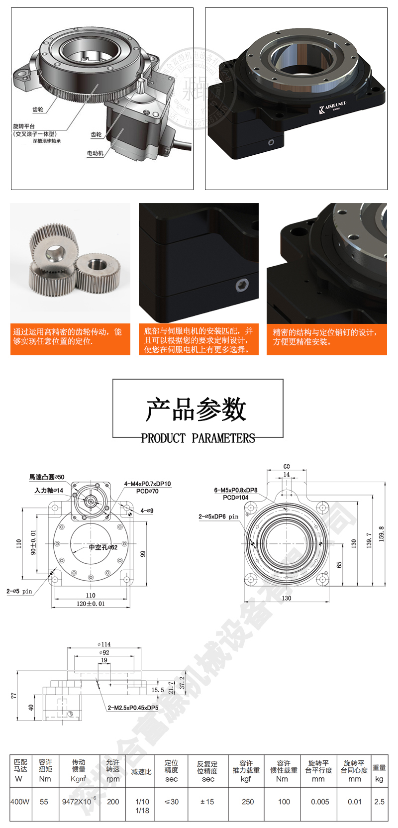 • 角度旋轉定位精準,精度0.5弧分。如:盤面1000mm旋轉一圈誤差0.02mm 外殼鋁料,采用加工中心一次裝夾成形,加工精度高,幾何誤差小。同心度高 傳動齒輪材料20CrMnTiH鍛造成形。
